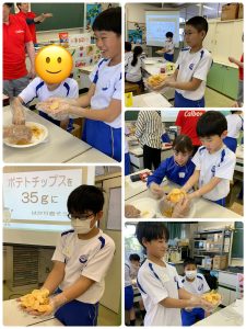 工作はフライパンでソーセージを炒めてみたり、レタスをちぎったりくしゃくしゃにしてお料理したり、長〜いポテトはハサミで半分に切って上手にケースに入れていました。