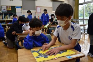 登校してから授業が始まるまでの時間、6年生が1年生のお世話をしています。